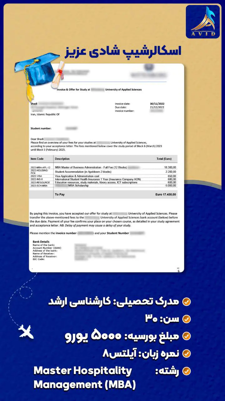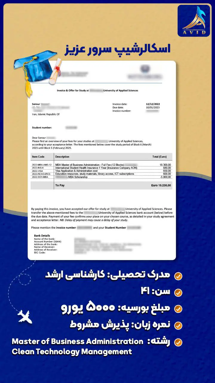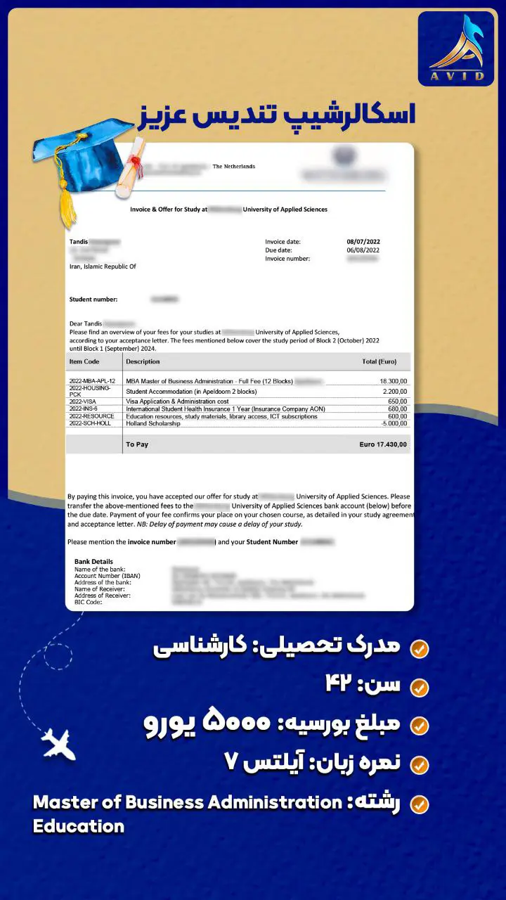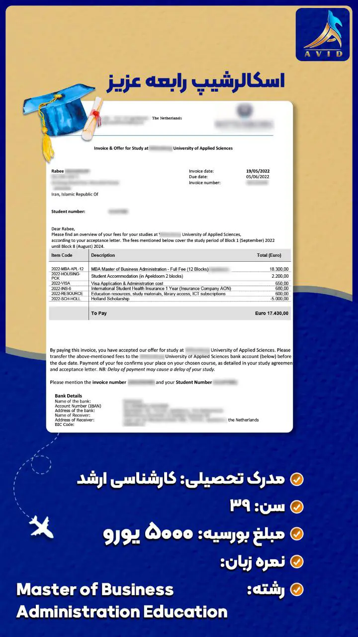 گروه مهاجرتی آوید با سابقه درخشان در زمینه مهاجرت تحصیلی و کاری به کشورهای مختلف، مفتخر است که با ارائه خدمات مشاوره تخصصی و همراهی متعهدانه در تمامی مراحل مهاجرت، در کنار شما باشد. ما با اتکا به دانش و تجربه تیم مجرب خود، پرونده های مهاجرتی متعددی را با موفقیت به سرانجام رسانده ایم و راه را برای متقاضیان عزیز جهت رسیدن به اهدافشان هموار کرده ایم. در این راستا، ما مفتخریم که به اطلاع شما برسانیم، گروه مهاجرتی آوید در زمینه دریافت انواع ویزا و بورسیه تحصیلی از دانشگاه های معتبر در سراسر جهان، سابقه ای درخشان دارد. ما با تسلط بر قوانین و الزامات مهاجرتی کشورهای مختلف، و همچنین با شناخت دقیق از معیارهای پذیرش دانشگاه ها و موسسات آموزشی، شانس موفقیت شما را در اخذ ویزا و بورسیه تحصیلی به طور قابل توجهی افزایش می دهیم.